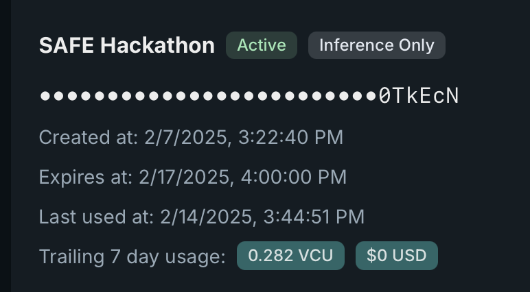 The API key dashboard now shows the last date an API key was used, and the trailing 7 day usage in USD and VCU.